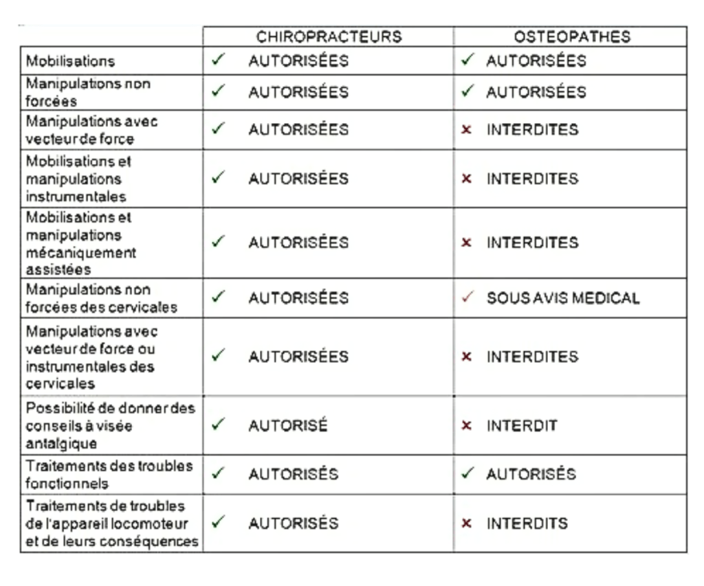 Les ostéopathes ont besoin d’un certificat délivré par les médecins pour toute manipulation cervicale, n’ont pas le droit d’utiliser d’instruments ni de s’occuper de nourrissons de moins de 6 mois.